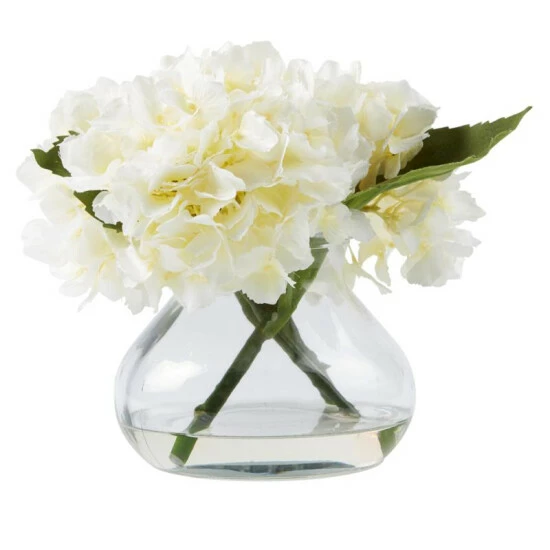 Bring bright, year-round color to your desk to tabletop with these artificial hydrangeas. The clear glass vase features liquid illusion simulated water, further enhancing the realistic look of this arrangement.
