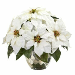 Nearly Natural 14 in. White Poinsettia in Designer Silver Bowl