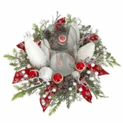 Spread cuteness during the holiday season with this Christmas artificial candelabrum. Set the scene, create a cozy welcoming greeting with the mini white Christmas trees adorning the base of the candle holder. Flocked evergreen are accented by white berries and snowed twigs.