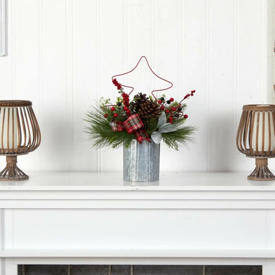 Spread holiday cheer with this Christmas artificial arrangement, showcasing a medley of mixed colors, accented with pinecones. The single Poinsettia flower in bloom creates a focal point while the decorations bring different textures and the star makes you feel nostalgic. It looks great in the mantel, Christmas Eve dinner table and home office, or as a lovely present.
