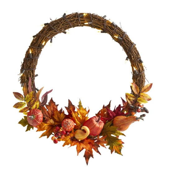 22 in. Pumpkin and Maple Artificial Autumn Wreath with 50 Warm White LED Lights Materials:Glue, Iron Wire, Plastic, Polyester Materials, Vine Dimensions:22 In Round