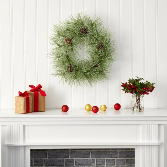 Nearly Natural 24β Iced Pine Artificial Wreath with Pine Cones
