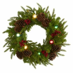 Intricately designed from realistic looking foliage in a palette of seasonal evergreens and dotted with faux pinecones and holly berries, this pre-lit artificial wreath is sure to light up your holiday season. Pre-strung with 50 multi-colored LED lights and 7 round (G40) bulbs, this decorative wreath makes an inviting holiday accent. Plugs into wall outlet.