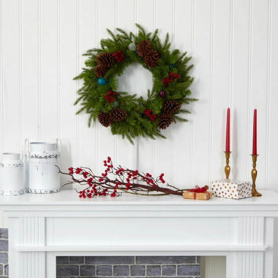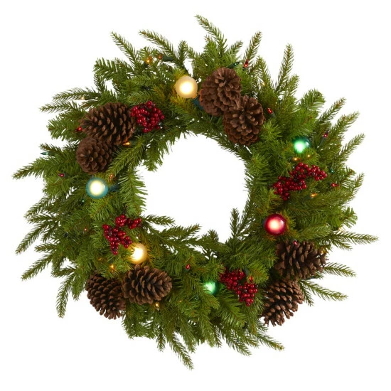 Nearly Natural 24 in. Wreath with 50 Multicolor Lights and Globe Bulbs