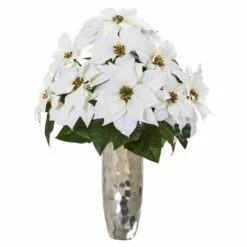 Nearly Natural 27 in. White Poinsettia in Silver Cylinder Vase