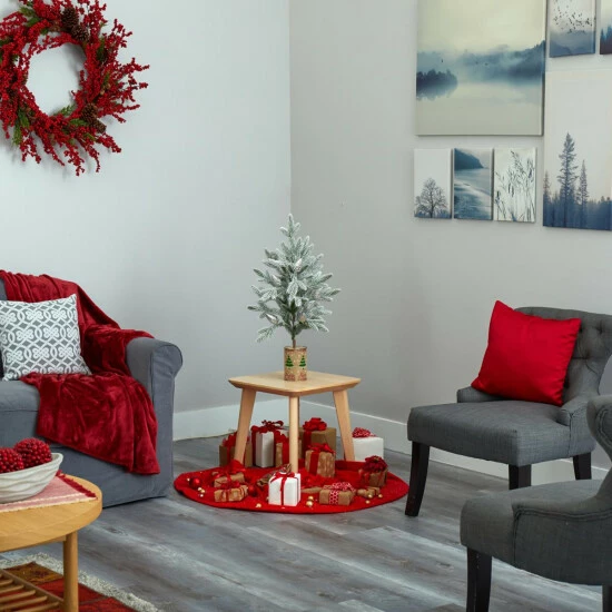 Evoke hints of the season no matter the space restriction with the help of this flocked artificial Christmas tree. Easy to set up and entirely maintenance-free, this timid little faux tree features a naturally sparse-like design with slender bendable branches for easy decorating and finished with a frosting of faux snow to evoke a winter-inspired setting. Standing just over 28β tall and carefully stabilized in a decorative planter, this flocked artificial Christmas tree would undoubtedly make a stunning addition to any winter decor scheme. Materials:PE, Iron Wire, Flocking Dimensions:H: 28 In. W: 12 In. D: 12 In