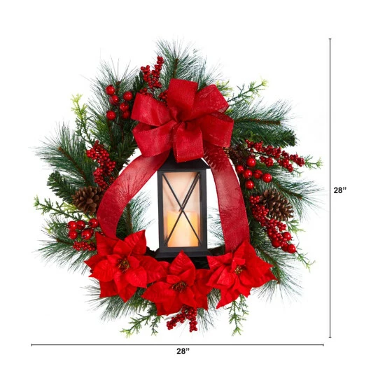 Nearly Natural 28β Poinsettia and Berry Holiday Lantern Christmas Wreath with LED Candle