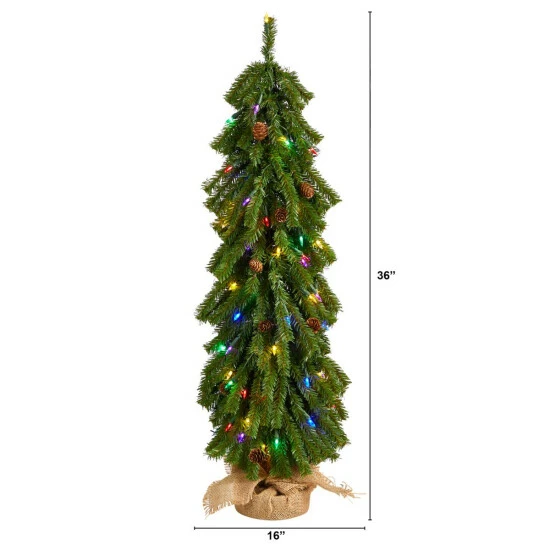 If you’re looking for a natural-looking Christmas Tree, you can’t go wrong with this Artificial Christmas Tree with pinecones. Inspired by mother nature, downward sloping needles in tiers look incredibly lifelike – as their natural counterparts. Accented by 50 multicolored lights and pinecones and designed by horticulturists from high-quality materials, feel free to bend the 104 branches. Standing 3′ from a burlap base (included in height) house in any compact area. Perfect for an office, mantel or tight area.