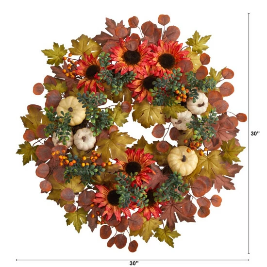 Nearly Natural 30 in. Sunflower, Pumpkin and Maple Leaf Wreath