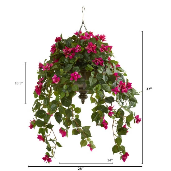 This artificial bougainvillea plant is a year round favorite. Boasting flirty little blooms beautifully highlighted against the dark greens of its realistic leaves that cascade from a hanging metal bowl, it evokes a touch of the Mediterranean.Reaching 37β long and designed for effortless display options.