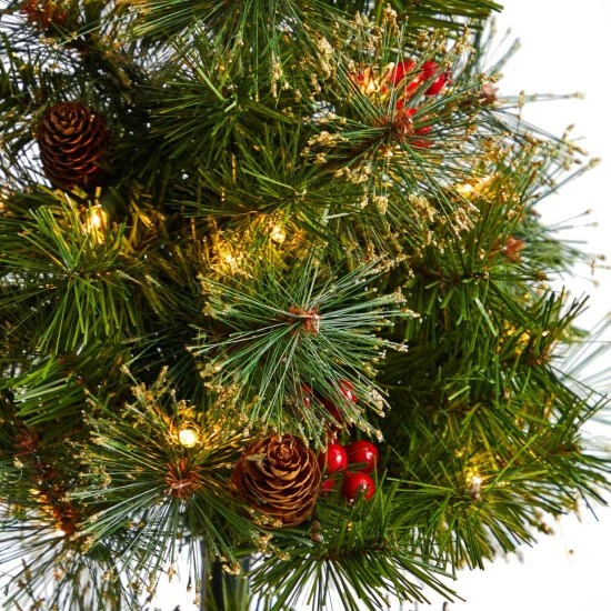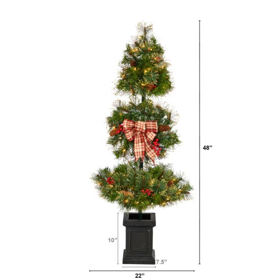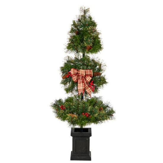 Have a little corner in need of some green? Just in time for the holiday season, add this cute artificial Christmas tree to a small space and spread holiday cheer. Three tiers of soft-hued evergreens are accented by pinecones and berries for a berry attractive look. Inspired by nature and crafted from high-quality materials, a decorative ribbon adds a nice touch. Light the night with 70 clear LED lights. Standing 4′ from a planter, house in any compact space.