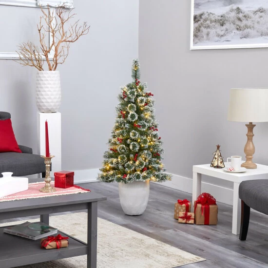 Have a berry merry Christmas with the help of this frosted Swiss Pine Artificial Christmas Tree. Inspired by nature, this robust silhouette mimics the real natural foliage and texture found in their counterparts with snow in the easy-to-bend branches. Arriving pre-strung with 100 clear LED lights for a warm, candle-like glow β this cute artificial Christmas tree also comes dressed from top to bottom with faux berries.