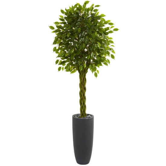 The expertly designed and well-made Nearly Natural artificial Ficus tree has an elegant, exotic braided trunk and incredibly realistic rich leaves, all contained in a gray cylinder planter topped with matching river rocks. This UV resistant piece is easy to fit in a tighter space, so place it in a corner in your hallway or near your entrance to add some excitement to an often overlooked space.
