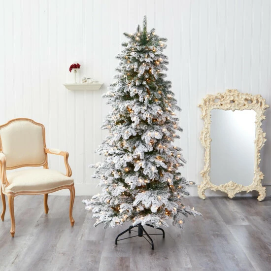Create a winter-inspired Christmas scene without the hassle of upkeep or maintenance with the help of this flocked artificial Christmas tree. Perfect for tight, narrow spaces because of its slim silhouette, it boasts evergreen foliage made up of 1560 easy-to-bend branch tips for showcasing your favorite holiday ornaments- all fully flocked with faux snow to create a winteresque Christmas. Arriving pre-strung with 450 clear LED lights to eliminate tangles and carefully stabilized on a metal stand, this flocked 6β tall artificial Christmas tree will not only make decorating a breeze but ensure your home is holiday-ready for years to come.