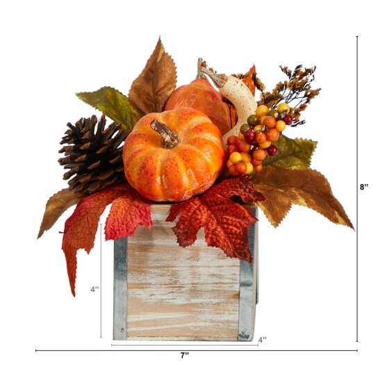 Get ready for the Harvest season with this Pumpkin and Pinecones Artificial Arrangement. Different colored pumpkins are housed in a rustic-inspired wood basket for a chic modern farmhouse look. Assembled from high-quality materials, realistic-looking leaves accent the pumpkins. Standing 8″ from a natural washed vase, house in any tabletop. Perfect for a mantel, kitchen, or office. Makes a fine gift too.