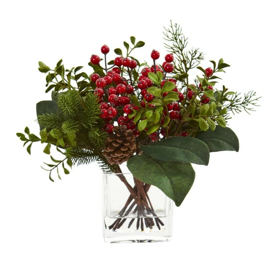 With a bundle of lush vibrant red berries and a various mix of green leaves, this Nearly Natural artificial berry pine arrangement will bring a festive holiday look to your decor. With its beautiful glass vase, it’ll make a great centerpiece on a end table, in your office, or anywhere else in your home.